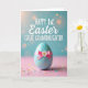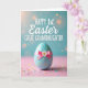 Este cartão mostra um grande ovo azul pastel sentado no terço inferior, sua superfície lisa pontilhada com minúsculos confetes multicoloridos que adicionam uma leve sensação de festa 🌷. Uma fita rosa brilhante envolve o meio e se amarra em um laço arrumado, encimado por uma única flor semelhante a uma margarida com centro amarelo ensolarado, como um pequeno presente oferecido com carinho. O fundo muda de um azul-esverdeado calmo no topo para uma área rosa bebê suave perto da parte inferior, criando um cenário suave de primavera onde uma ligação próxima pode ser imaginada. Círculos de luz quente e difusa brilham na área superior, como luzes de fada distantes observando a cena. Pequenos pedaços de confete estão espalhados pelo primeiro plano rosa, ecoando os pontos no ovo e mantendo a celebração 🐰. Na parte superior, letras brancas fluídas leem “Feliz 1º Páscoa Bisneta”, centralizadas e fáceis de ver contra os tons mais frios. O laço rosa do ovo e a pequena flor estão ligeiramente