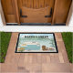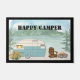 Feliz tapete de porta de camper. Acampamento no lago.