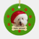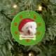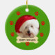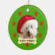 Este Enfeites de natal de osso e pata de cachorro apresenta um cachorro branco giro vestindo um chapéu de Natal com uma moldura verde com estampas de pata e um osso de cachorro que lê "Felizes Feriados". Um Enfeites de natal divertido para o amante do cachorro. Direitos autorais de Henis