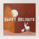 Feriados felizes tipografia em fundo temático de férias em marrom, que inclui árvores do Fir de Natal, lua e renas.