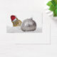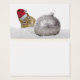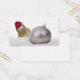 Este bonitinho esquilo vestindo um chapéu de Papai Noel está se espiando por trás de uma decoração de ornamento de bola de Natal prateada na neve e pronto para uma festa de Natal.