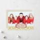 Uma bonito borda verde, vermelha e oca bronca está na parte inferior desta placa plana do modelo de foto de Feriado. Sua própria fotografia cobrir a parte superior, e um banner de borda vermelha correspondente separa as duas partes. "Felizes Feriados!" é a primeira linha na faixa, com seu próprio texto em vermelho correspondente. A parte traseira do cartão é igual ao bronzeado, o que permite que você escreva sua própria mensagem pessoal, se quiser. Festivo e bonito!