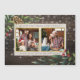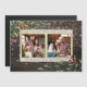 Este cartão de feriado magnético é um alternativo incrível para os convites em papel que seus amigos e familiares certamente amam! Esta design apresenta um belo e escuro fundo de madeira rústico com uma delicada camada de flocos de neve. Nos cantos superior esquerdo e inferior direito encontram-se alguns prigos festivos pintados à mão com pínus cones e bagas. No centro do cartão estão 2 fotos quadradas com delicadas bordas de folha de ouro com "desejamos a você um Feliz Natal" acima e "com amor de", e então seu nome de família, abaixo das fotos.