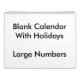 Os calendários de vazio são extremamente úteis quando tentamos planejar nosso tempo para a família, os negócios e os hobbies. Se não queremos perder tempo para desenhar sempre as mesmas linhas, podemos usar modelos preparados, que já são pré-desenhados em diferentes formatos, alguns são extremamente minimalistas, outros têm poucos detalhes, como feriados, já marcados. Todos os calendários são completamente personalizáveis, para que possamos encomendá-los em diferentes cores, tamanhos, com as nossas próprias fotos, logotipos, citações inspiradoras ou o que quer que seja que nos possa ajudar a sentir-nos melhor com estas ferramentas de planeamento finais. Lembrem-se, há tempo para o planeamento e para a ação. O equilíbrio certo de ambos provou trazer os melhores resultados! Calendário de grandes Vazios com feriados com grandes números é calendário de doze meses e tem texto personalizável preto no cobrir e fio branco. Ele mede 14,25 polegadas por 11 polegadas. Os eventos e feriados dos Estados Unidos também são adicionados e impressos em vermelho. Todos os números no calendário são grandes, mas se forem grandes demais, você pode simplesmente alterar o Estilo de Grade.