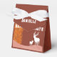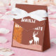 Feriados felizes tipografia em fundo temático de férias em marrom, que inclui árvores do Fir de Natal, lua e renas. Caixa de Favoritos Personalizada.