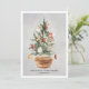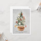 Árvore de Natal de pinho verde tradicional no cesto. Decorado com um preguiçoso, chifre francês e ornamentos clássicos vermelho e branco. Duas linhas de texto abaixo, deixe você personalizar seu cartões de natal.