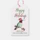 Uma bela etiqueta de presente de Natal personalizada, com um beija-flor arruinado vestindo um chapéu de Papai Noel. O estilo, o tamanho e a cor da fonte podem ser alterados clicando em "personalizar mais".