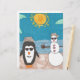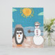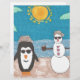 Um boneco de neve e um pinguim tiram férias para a praia.