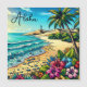 Aloha! Bonito costa tropical costeira. Bonito água azul, palmeiras, flores tropicais e um farol no fundo. Ai arte feita no estilo de pop de quadrinhos.