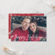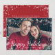 Este cartão de feriado festivo apresenta uma sobreposição de moldura de flocos de neve brancos e uma escrita elegante para personalizar. O verso inclui a mesma arte com fundo vermelho e texto para sua mensagem.
