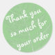 "Muito obrigado pelo seu pedido" em uma cor de fundo personalizável (verde padrão) com um fronte desenhado à mão. O texto é totalmente personalizável (fonte, cor e o que ele diz).
