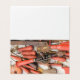 Uma coleção de ferramentas antigas antigas e vermelhas manipuladas em uma mesa num mercado de pulgas.
