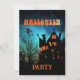 Um convite de Dia das Bruxas assustador com uma casa escura e uma bruxa numa vassoura. Altere as informações do seu próprio convite de festas pessoal personalizado. Escuro e laranja para criar uma atmosfera assustadora.