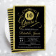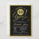 Convite de festa de aniversário de casamento de 10 anos em dourado de brilho falso e preto. Cartão de convite impresso com fonte de letra cursiva de tipografia elegante e listras no verso. Saúde pelos 10 anos! Pode ser personalizado para qualquer ano de aniversário. Perfeito para uma celebração de aniversário de 10 anos com estilo.