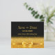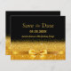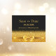 A festa de aniversário elegante, clássica, glamourosa e feminina (ou qualquer idade) salva a data. Uma fita e um arco dourados falsos. Fundo preto. Com o texto: Salve a data na frente, escrita com letras de bloco modernas. Personalize e adicione a data e o nome/texto.