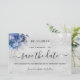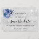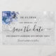 Uma cinta e moda Salve a placa Date para uma festa de aniversário 50th (ou qualquer idade). Um clássico fundo metálico falso prateado, decorado com poeira falso prateada e flores azuis. Personalize e adicione uma data e nome/idade. O texto: Salvar a Data é gravado com um script de estilo com letra de tendência grande.