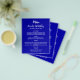 Por favor, note que este menu está no papel folheto e muito fino. Os envelopes não estão incluídos. Para menus mais espessos (mesmo design) visite nossa loja. Um fundo azul real. Texto branco. Frente: personalize e adicione seu nome, data e menu.