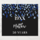 Uma etiqueta para uma festa de aniversário 50th (ou qualquer idade). Um fundo preto com confete azul. Personalizar e acrescentar ano de nascimento, nome e idade. O nome é escrito com um elegante script de estilo escrito à mão.