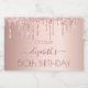 Uma minietiqueta de vinho espumante para uma festa de aniversário cinzenta e glamourosa 50ª (ou qualquer idade) com as raparigas. Um fundo metálico rosa dourado falso com um brilho elegante de rosa dourado, pintura gota-a-gota. O texto: O nome é escrito em ouro rosa escuro com um grande estilo escrito à mão moderno e balançamentos. Para manter as hastes, exclua apenas o nome da amostra, deixe os espaços ou emoji na frente e depois do nome. Personalize e adicione um nome, 50 anos e uma data.