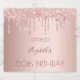 Um rótulo de garrafa de vinho para uma festa de aniversário cinzenta e glamourosa (ou qualquer idade) com as meninas. Um fundo metálico rosa dourado falso com um brilho elegante de rosa dourado, pintura gota-a-gota. O texto: O nome é escrito em ouro rosa escuro com um grande estilo escrito à mão moderno. Modelo de nome, 50 anos e data.