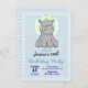 Hip Hippo Ray É aniversário de alguém. Pequenos convites de aniversário azuis-claros são perfeitos para o seu evento de festa temática hippo. Doce trabalho de arte de Valarie Wade. O texto ajustável é fácil de usar neste modelo personalizado.