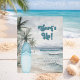 Um convite para uma festa de aniversário de praia retrô. Uma praia arenosa de cor aquática, ondas oceânicas e palmeiras como fundo, e uma prancha azul na praia. 1 folha = 1 convite impresso de borda a borda.