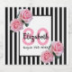 Uma etiqueta para uma festa de aniversário elegante. Listras verticais negras e brancas clássicas como fundo. Com rosas rosadas femininas e femininas como decoração. Um quadro na frente com modelo para os 80 anos, nome e data. Número de idade em rosa, nome e data em preto. O nome é escrito com um script de estilo manuscrito.