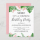 Palmas Tropicais Verdes e Flores Rosa Esbranquiçadas Flores Cor de Água Shhh ... Convites de festas de aniversários surpreendentes com fundo cor-de-rosa esbranquiçado que inclui uma bela e elegante tipografia de guião com modernas flores cor-de-rosa azul e verde tropical havaiano.