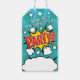 Etiquetas de presentes do Festa de BD que incluem uma tipografia no estilo de quadrinhos de 'FESTA!'. Isso inclui elementos de explosões em quadrinhos, estrelas e fundos de estouro em azul, laranja, amarelo e vermelho. Coloque-os em favoritos para festas para dar aos seus convidados. Personalizar com uma mensagem. Espaço extra nos nomes de gravação ou na mensagem de baixo para mão.