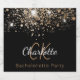 Para uma festa de despedida de solteira elegante. Um fundo preto chique com manchas de brilho dourado falso. Personalize e adicione um nome e iniciais de monograma. O nome é escrito em cor dourada com um estilo de letra manuscrita moderna. Letras brancas e douradas.