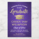 Adicione um toque personalizado às decorações de festas de formatura ou colégios com estas elegantes etiquetas de mini garrafa de vinho roxa, ouro e branco. Design apresenta um fundo de aço inoxidável esfregado, tipografia moderna na moda, caligrafia de scripts manuscritos e uma mensagem personalizável lendo "Parabéns para nosso Formando". O texto na parte inferior inclui ano de aula, nome de escola e linhas opcionais para grau, tipo de bebida ou outras informações. Todo texto é simples de personalizar. Observe que o ouro é impresso a cor, não a folha metálica. Essas etiquetas fazem uma ideia de na moda festa de formatura e uma elegante adição à celebração do dia especial do formando. Felicidades!