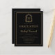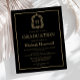 Este design de convite clássico, elegante, para festa de formatura de apresenta um monograma de cor dourada em letra serif aberta rodeada por uma crista de acanthus de linha num fundo preto. Personalize o texto com o nome do formando e os detalhes da parte. A parte traseira da placa é preta e sólida. Ideal para segundo grau, faculdade ou formando universitário.