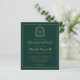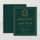 Este design de convite clássico, elegante, para festa de formatura de apresenta um monograma de cor dourada em letra serif aberta rodeada por uma crista de acanthus de uma linha em fundo verde-escuro. Personalize o texto com o nome do formando e os detalhes da parte. A parte traseira da carta está verde estável. Ideal para segundo grau, faculdade ou formando universitário.
