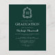 Este design de convite clássico e elegante para festa de formatura de apresenta um monograma branco inicial em letra serif aberta rodeada por uma crista de acanthus de uma linha de fundo verde-escuro. Personalize o texto com o nome do formando e os detalhes da parte. A parte traseira da carta está verde estável. Ideal para segundo grau, faculdade ou formando universitário.