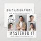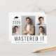 Anúncio de graduação e convite de festas de mestrados amigáveis com orçamento apresentando uma colagem de 4 fotos, "Mastered It" escrito na parte inferior em letras grandes e seu ano de aula, nome e faculdade ou universidade em tipografia simples. No verso, adicione os detalhes da festa de formatura.