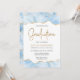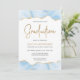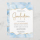 Este convite de festa de formatura de tendência apresenta uma borda superior e inferior do geode de agate de cor d'água em tons de azul claro com realces falsos de brilho dourado. A palavra "Graduação" aparece na falsa brilha dourada em letra decorativa moderna de escrita manual. Personalize o convite com o nome do formando em texto dourado e os detalhes da parte em cinzas de carvão em fundo branco. Uma imagem de azul pastel correspondente e de agate dourado aparece no lado oposto.