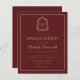Este convite de festa de formatura clássico e elegante apresenta uma inicial de monograma dourada em fonte serifada aberta, circundada por um brasão de acanto em linha artística sobre um fundo vermelho burgundy. Personalize o texto com o nome do formando e os detalhes da festa. O verso do cartão é burgundy sólido. Ideal para um formando do ensino médio, faculdade ou universidade.