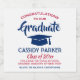 Adicione um toque personalizado às decorações da festa de formação da faculdade ou do ensino médio com estes elegantes rótulos para garrafa de vinho espumante vermelho, branco e azul. O design apresenta um fundo branco, um boné de formatura azul, tipografia moderna e estilosa, caligrafia estilizada à mão e uma mensagem personalizável que diz "Parabéns ao nosso Graduado". O texto na parte inferior inclui o ano da turma, nome da escola e linhas opcionais para grau, tipo de bebida ou outras informações. Todo o texto é fácil de personalizar. Esses rótulos são uma ideia estilosa para bebida na festa de formatura e um complemento elegante para a celebração do dia especial do graduado. Saúde!