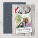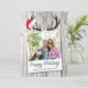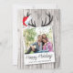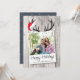 Cartão de férias rústico apresenta uma textura de madeira com chifres de veado e chapéu de Papai Noel. Adicione sua foto favorita neste layout exclusivo.