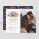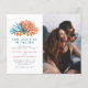 Este convite à festa de noivado de temas costeiros é ideal para casais que amam o mar. Apresentando as palavras "DOIS MENOS PEIXES NO MAR" em letra azul sans-serif sob dois peixes-palhaço e recifes de coral azul e laranja. Uma tipografia simples, mas moderna mostra seus detalhes de casamento com seus nomes destacados em uma matiz laranja à esquerda, e uma foto personalizada à direita. Invertendo a um padrão náutico com corda, recife de coral e peixe. Como parte da seleção do orçamento aqui no Zazzle, esses convites vêm em tamanhos limitados e estoques de papel. Se você precisar de um tamanho ou estoque de papel diferente, esse design pode ser transferido para um formato padrão 5x7 usando a ferramenta de transferência design para obter mais opções.