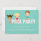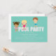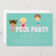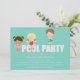 Este adorável convite de festas de piscina apresenta as palavras "festa de piscina" com crianças em maiôs de pé nas cartas. A cor de fundo é aqua esverdeada. Os campos de texto são completamente personalizáveis.