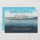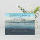 Anúncio do casamento da cena do oceano azul combinado com um convite para uma recepção para os recém-casados. Cartões horizontais têm uma visão da praia, com ondas intermitentes, como pano de fundo para texto personalizado. Escrito preto no topo para nomes e "Sr. e Sra." com texto impresso branco no fundo para incluir data e local da cerimônia privada com informações de convite. Cores azuis profundas. Se você mudar de tamanho de papel, verifique se todo o texto será ajustado e impresso bem longe das bordas do papel.