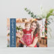Placa de cartões de natal moderna com uma foto personalizável de hemorragia de cheio na frente, com uma banda azul de cobertura vertical à esquerda, destacando o texto "Feliz Natal" em branco. Você pode carregar mais três fotos de sua família favorita e sua mensagem de saudação pessoal no verso do cartão.