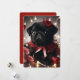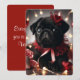 Adorável cartão de dia dos namorados pug - Celebre o amor e a graça com este encantador cartão de dia dos namorados com um lindo pug preto vestido com fitas vermelhas festivas, cercado por luzes brilhantes e rosas românticas.