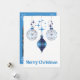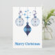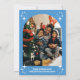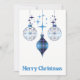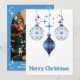 Elegantes silhuetas de enfeites vintage envoltas em xadrez azul brilhante são cercadas por estrelas azuis na frente deste design celestial de Natal. O verso deste cartão brilhante e alegre tem uma moldura em arco para a sua foto de Natal, bem como espaço para uma mensagem especial.