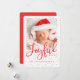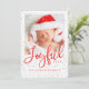 Comemore as férias com um cartão com fotos de feriado na moda Joyful. O Cartões de foto de Natal apresenta pontos falsos de folha prateada que fazem fronteira com o cartão, as palavras "Joyful" em uma fonte vermelha de script de na moda, e um espaço reservado para sua foto, ano atual e nome da família. A parte de trás apresenta um fundo vermelho com uma textura branca clara e nevada.