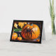 Este cartão de Halloween apresenta uma cena de outono vibrante e festiva centrada em torno de uma grande abóbora laranja. A abóbora é o ponto focal da imagem, com uma superfície brilhante e lisa que captura a luz, fazendo-a parecer fresca e pronta para o Halloween. Sentado de forma proeminente na abóbora está uma grande aranha preta com detalhes laranja. A aranha tem uma aparência assustadora e realista, com pernas longas e segmentadas e um corpo que parece brilhar à luz, adicionando um toque de assustador à cena, que de outra forma é quente e acolhedora.