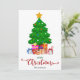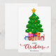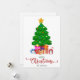 Cor de fundo branco Feliz Natal em tipo de letra estilo script com um gráfico de uma árvore de Natal e presentes embrulhados por baixo design. Este cartão de Natal é projetado para que você possa alterar a cor do fundo e também inserir o nome da sua família. Você também pode editar este design para alterar a cor da palavra "Natal" se desejar.