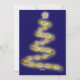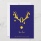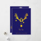 Uma imagem abstrato engraçada e fofa de uma cabeça de rena em ouro falso. Com Enfeites de natal, bolhas penduradas nas galhadas. Fundo azul moderno e elegante, letras de Ouro e o texto: ho-ho, personalize e adicione seu texto e seu nome de família. Volta: uma abstrato brilhando árvore de Natal em ouro falso. Cor de fundo azul.