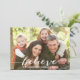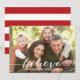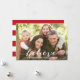 Envie seus cartões de natal de Natal de 2014 para seus amigos e familiares usando este cartão com fotos de feriado contemporâneo maravilhoso e simples com a palavra "Acredite" escrita em uma camada de caracteres branca de escrita manual clássica. Design da ELKE CLARKE © Outras cores e vendas disponíveis no nosso compro em www.zazzle.com/monogramgallery. Substitua a foto de exemplo por sua. Fundo listrado vermelho e branco na parte traseira do cartão.